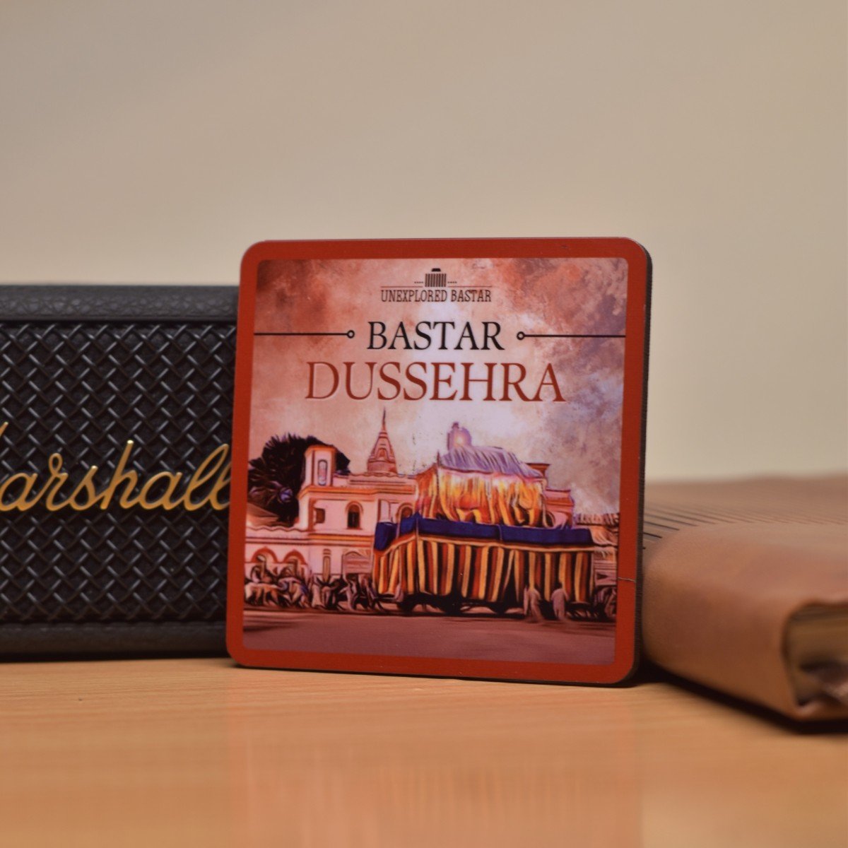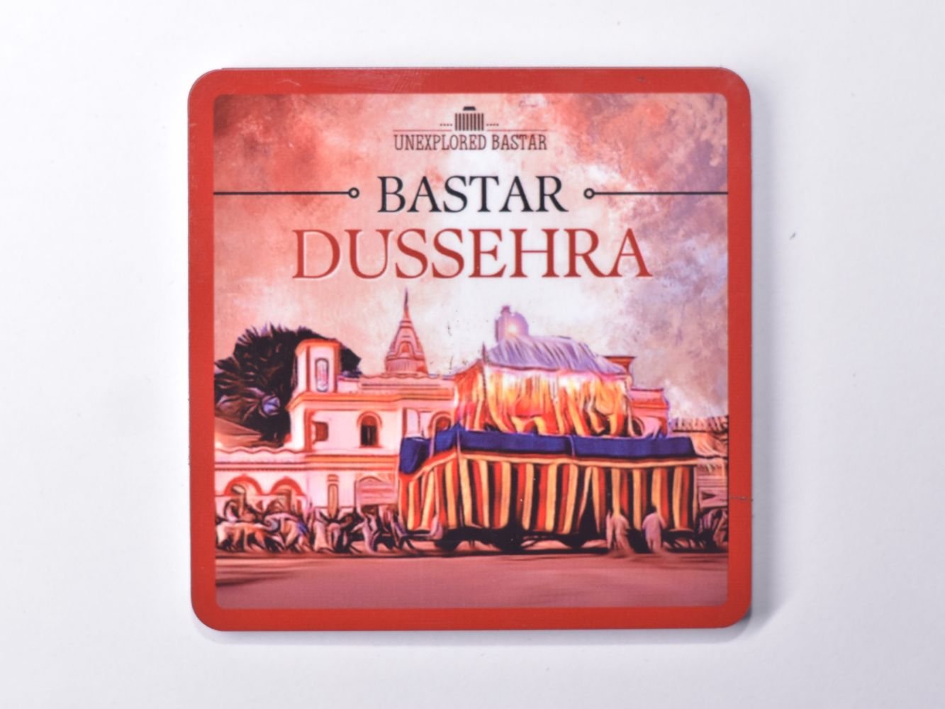 Featuring a rich red border and a beautifully stylized digital illustration of the temple and the grand chariot, this piece serves as a window into the heart of tribal India. Whether you use it as a functional coaster or a decorative fridge magnet, it adds a touch of ethnic elegance to your space.
