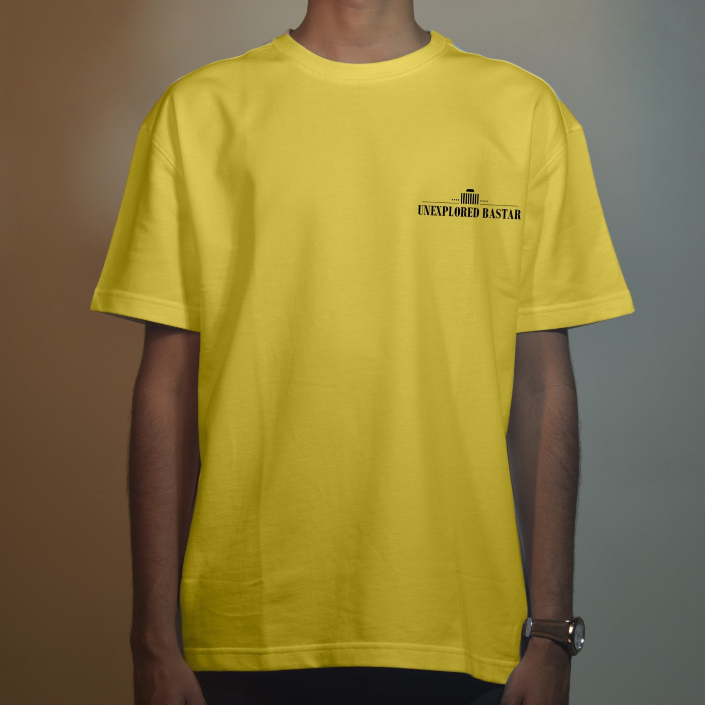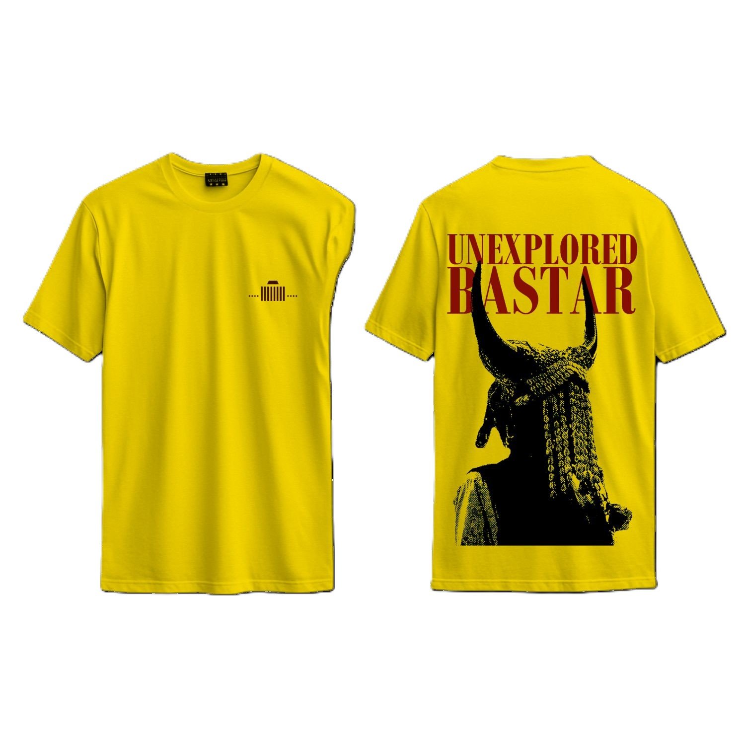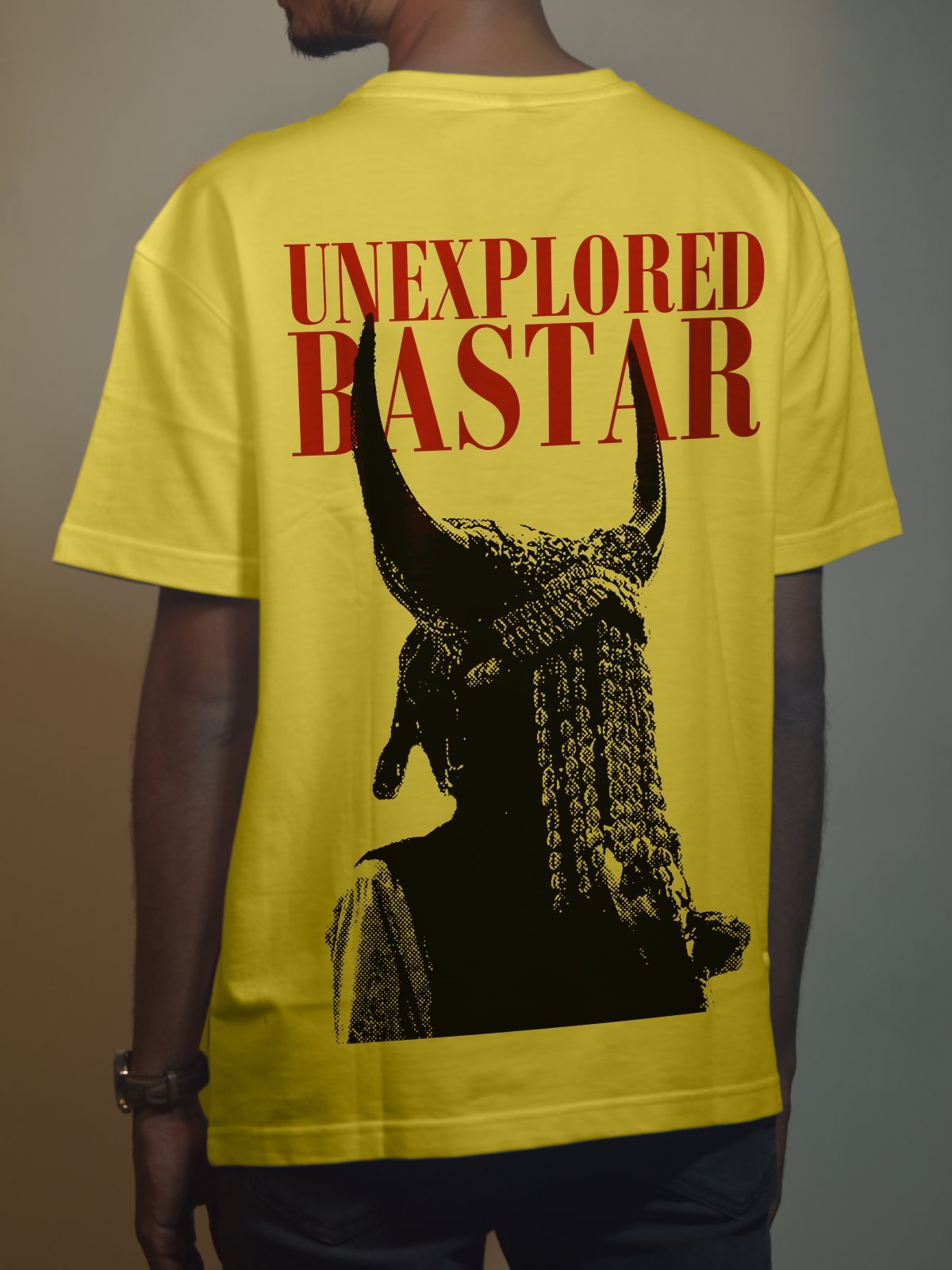 Wear the spirit of Bastar with this striking cultural tribute. This premium yellow T-shirt features a high-definition duotone back graphic of a Maria tribal man in his iconic ceremonial bison horn headdress.