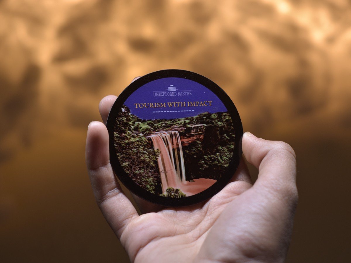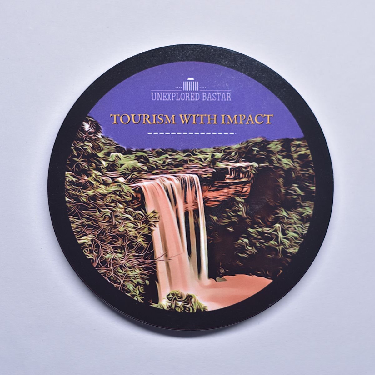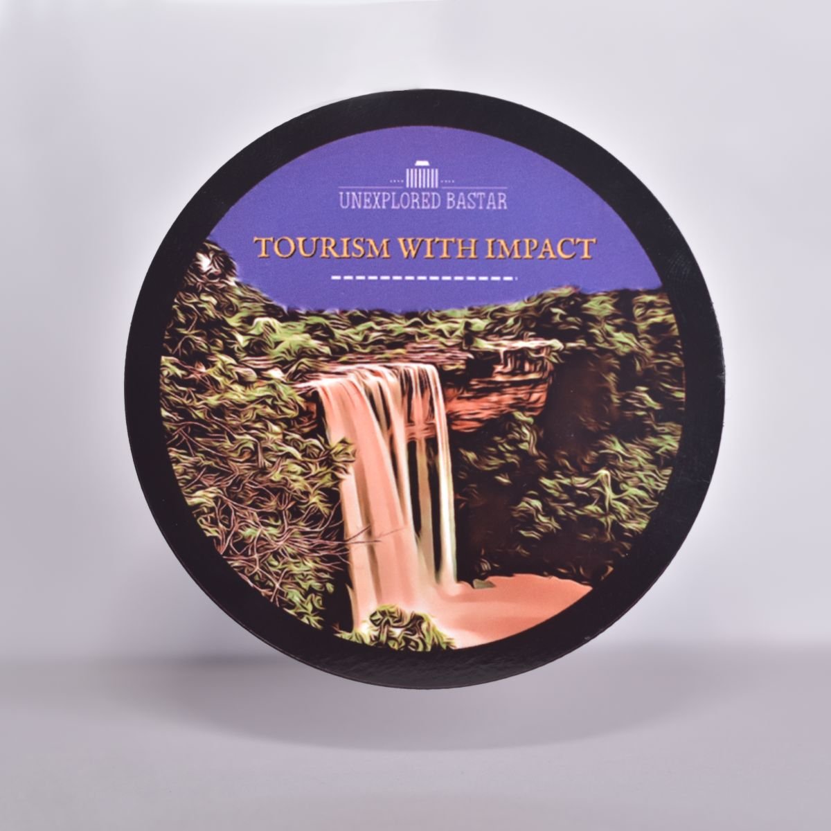 Bring the majestic beauty of Bastar’s waterfalls to your home with this premium circular fridge magnet. Featuring an artistic digital rendition of a cascading waterfall and the empowering slogan “Tourism with Impact,” this souvenir is a tribute to sustainable and meaningful exploration.